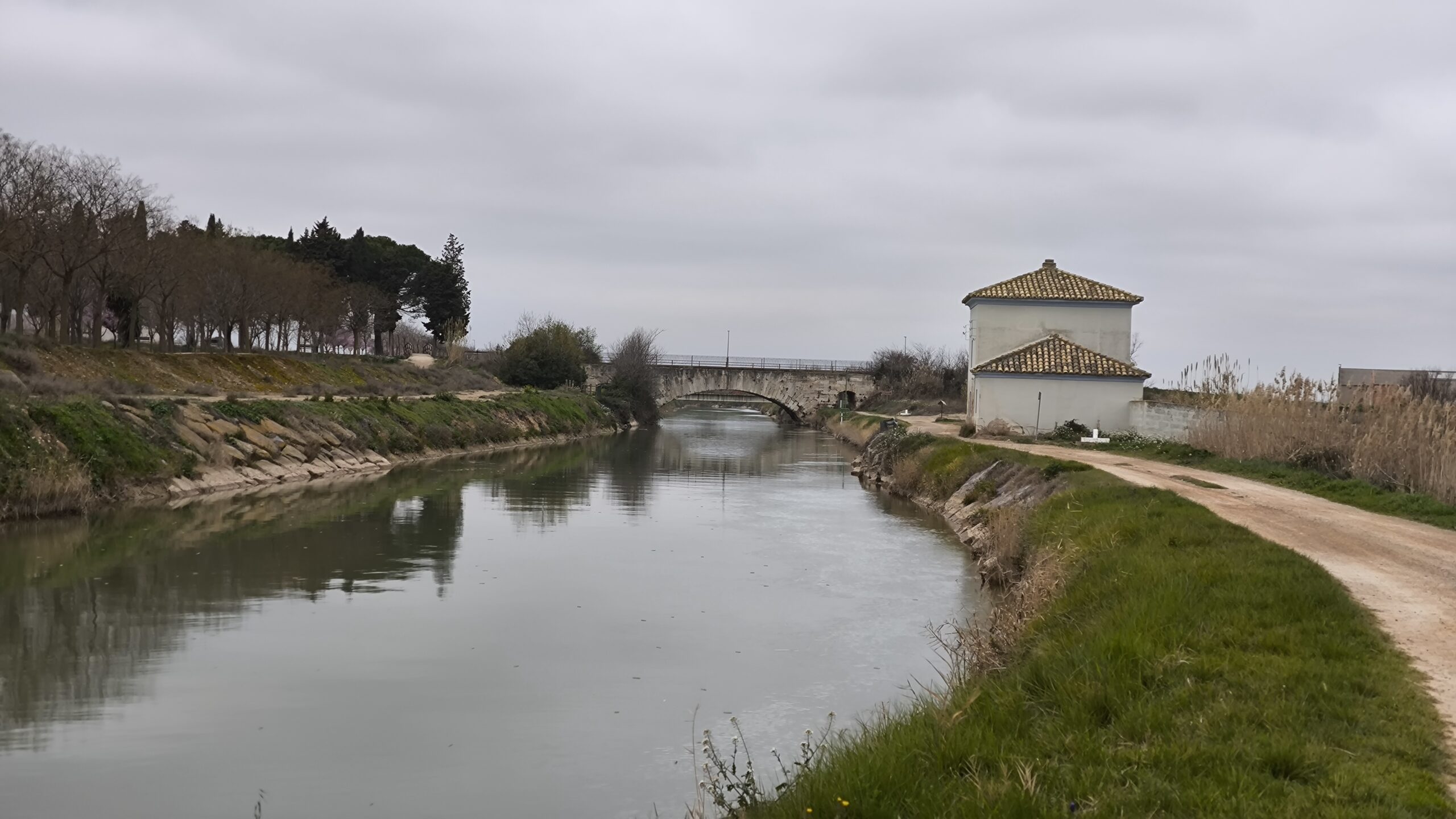 Llevo 45 km cuando aparece Gallur. El paso del canal por este pueblo es especialmente significativo, ya que el canal se eleva sobre el casco urbano y permite una vista panorámica de la llanura de inundación del Ebro. Aquí se instalaron importantes industrias harineras y molinos que aprovechaban la fuerza del agua y la facilidad de transporte que ofrecían las barcas del canal antes de la llegada del ferrocarril. Ya te puedes imaginar que el canal era, en esencia, la columna vertebral de un sistema de transporte multimodal que conectaba el interior de Aragón con el valle superior del Ebro para facilitar el comercio de granos y productos agrícolas hacia el Cantábrico. La presencia de puentes de piedra, con sus arcos rebajados para permitir el paso de las embarcaciones, sigue siendo un recordatorio de esa época dorada de la navegación fluvial. Hasta se ofrecían travesías para viajeros que llevaban un día completo desde Zaragoza hasta El Bocal.